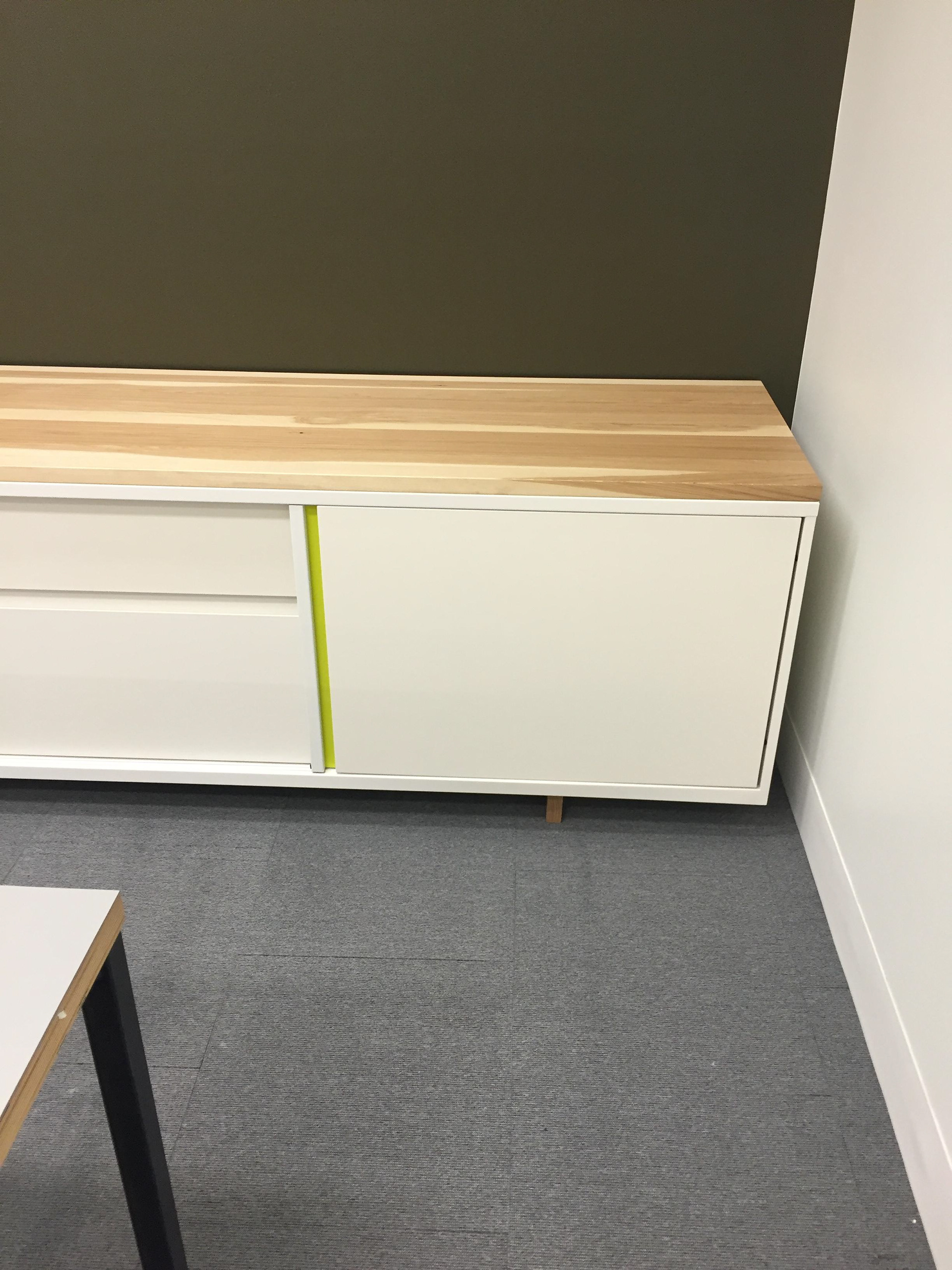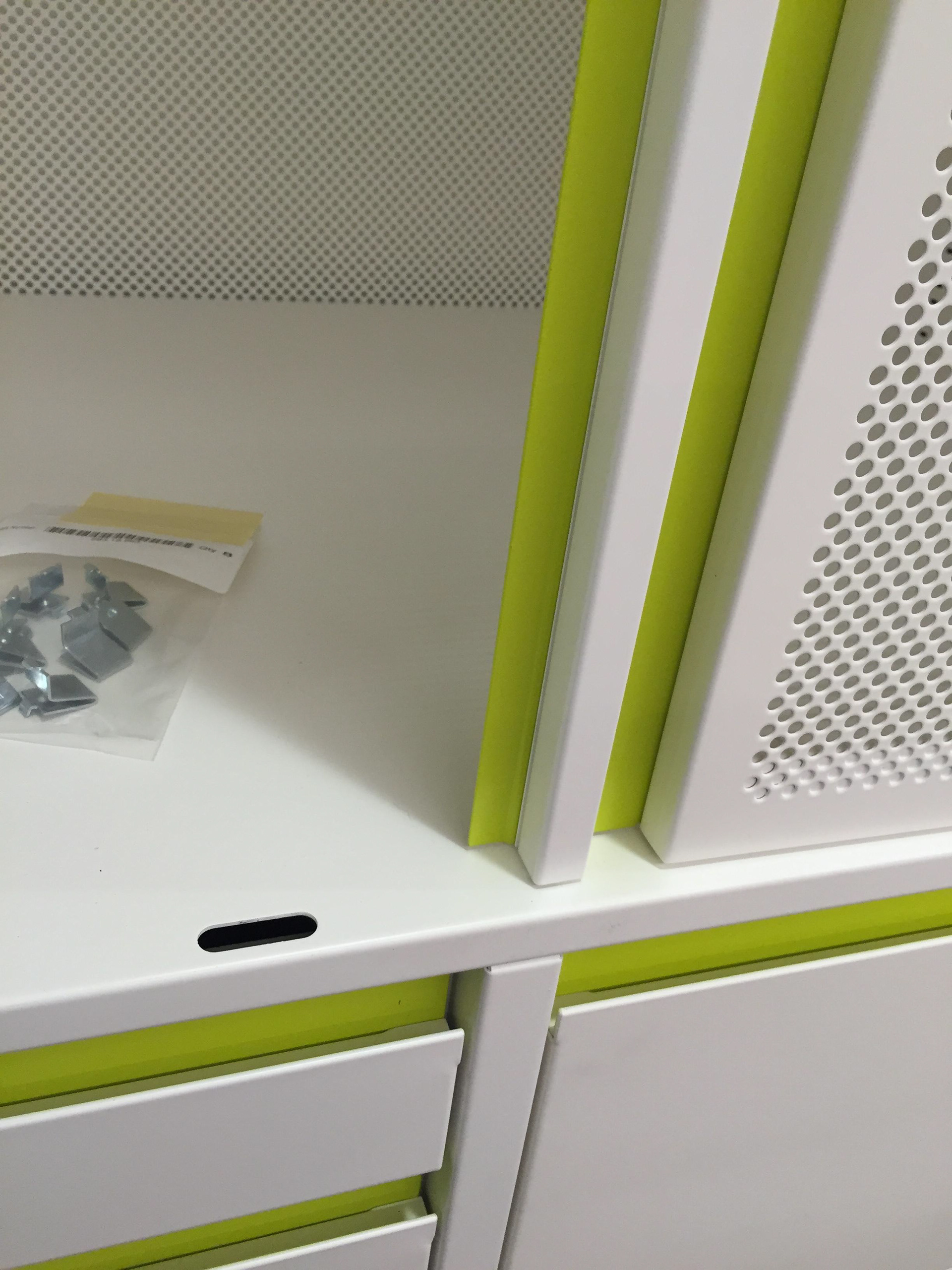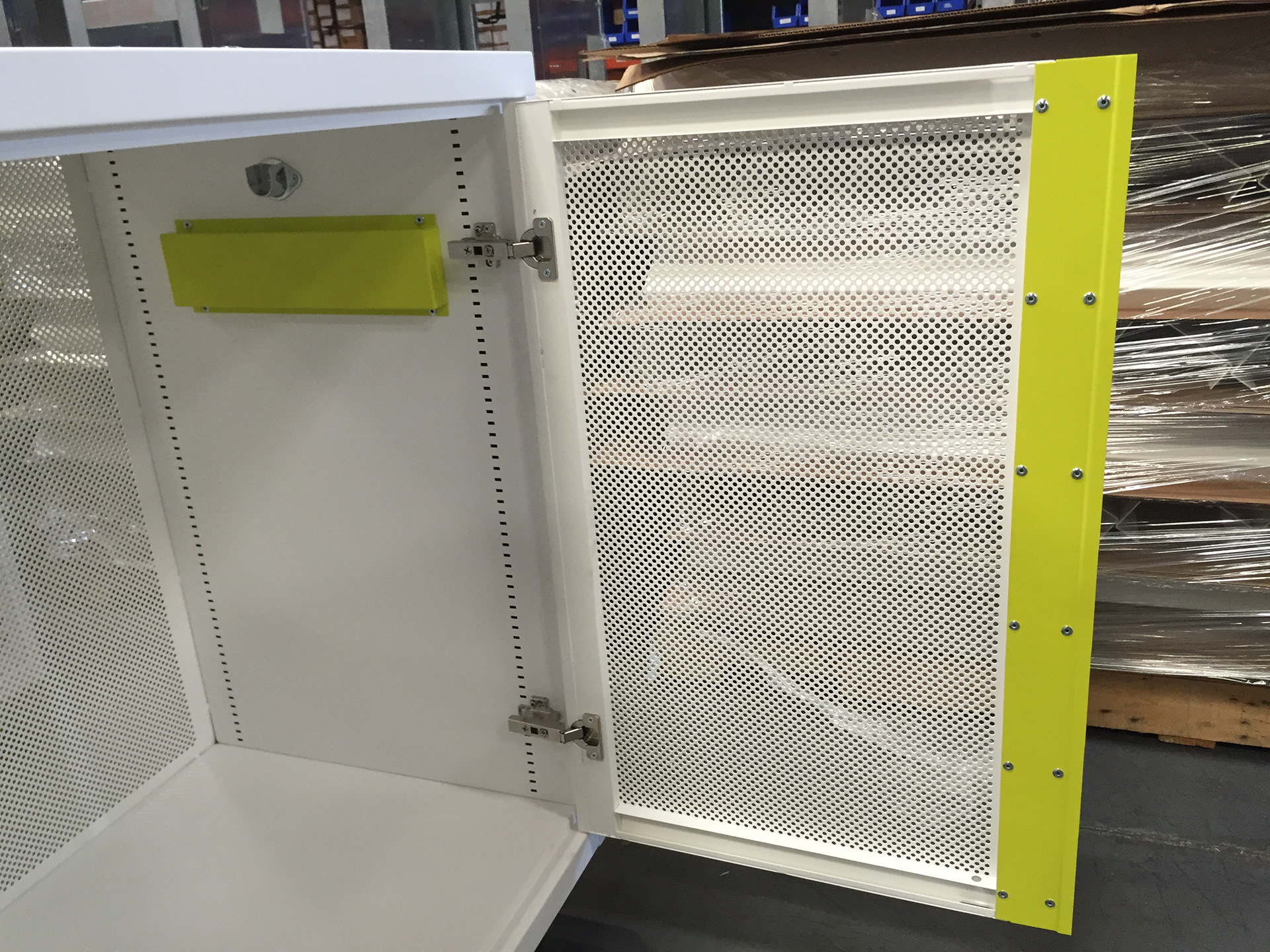 The cabinets were made in steel with a custom white and green powder coat finish, the construction of the cabinets is made seamless and the front doors are self closed.