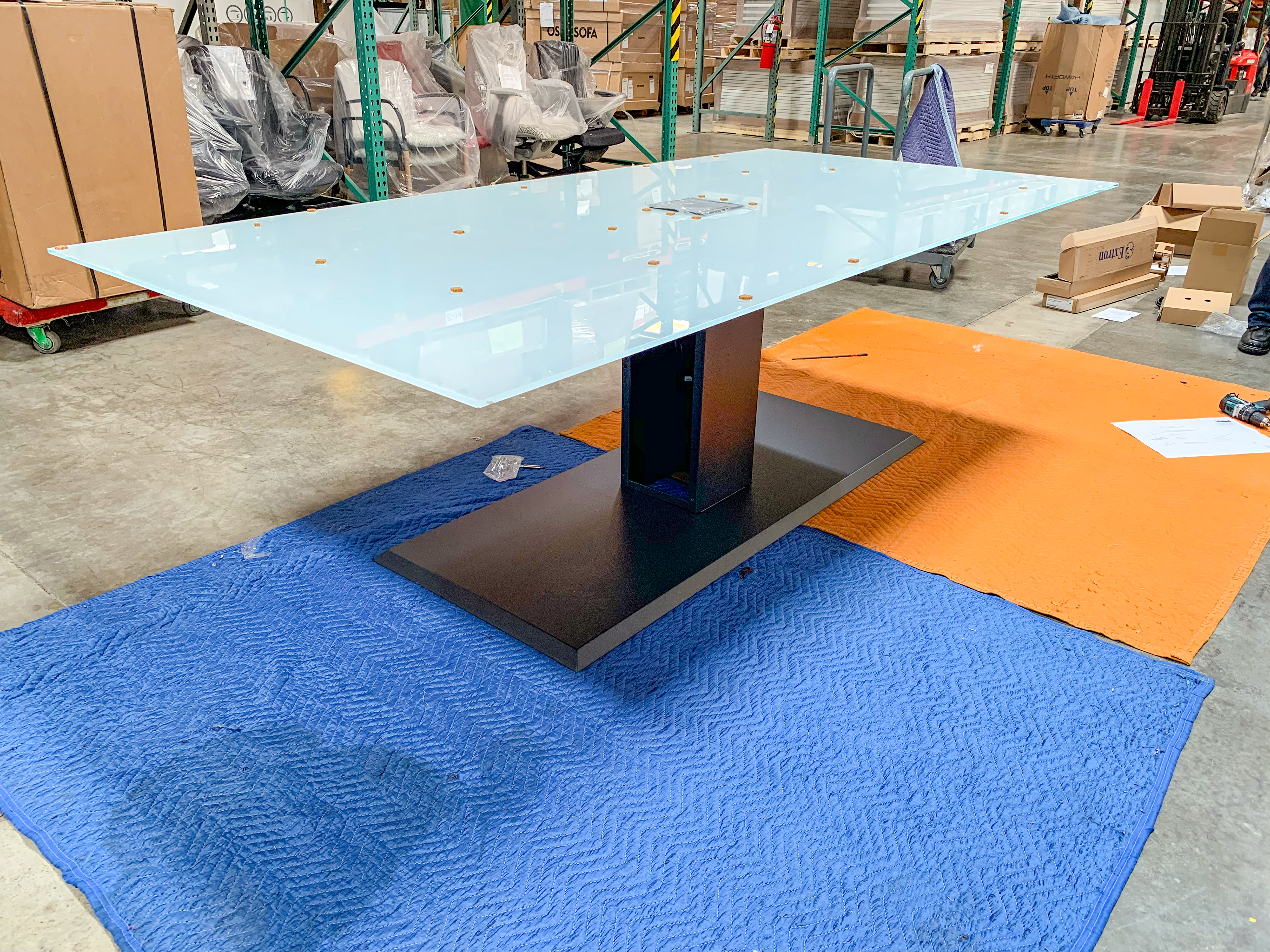 I was given the opportunity to design, engineer and supervise the production of the two tables. The base construction was made in cold-rolled steel with a field house powder coat, while the tabletop was made with 3/8” tempered glass in a white backing.