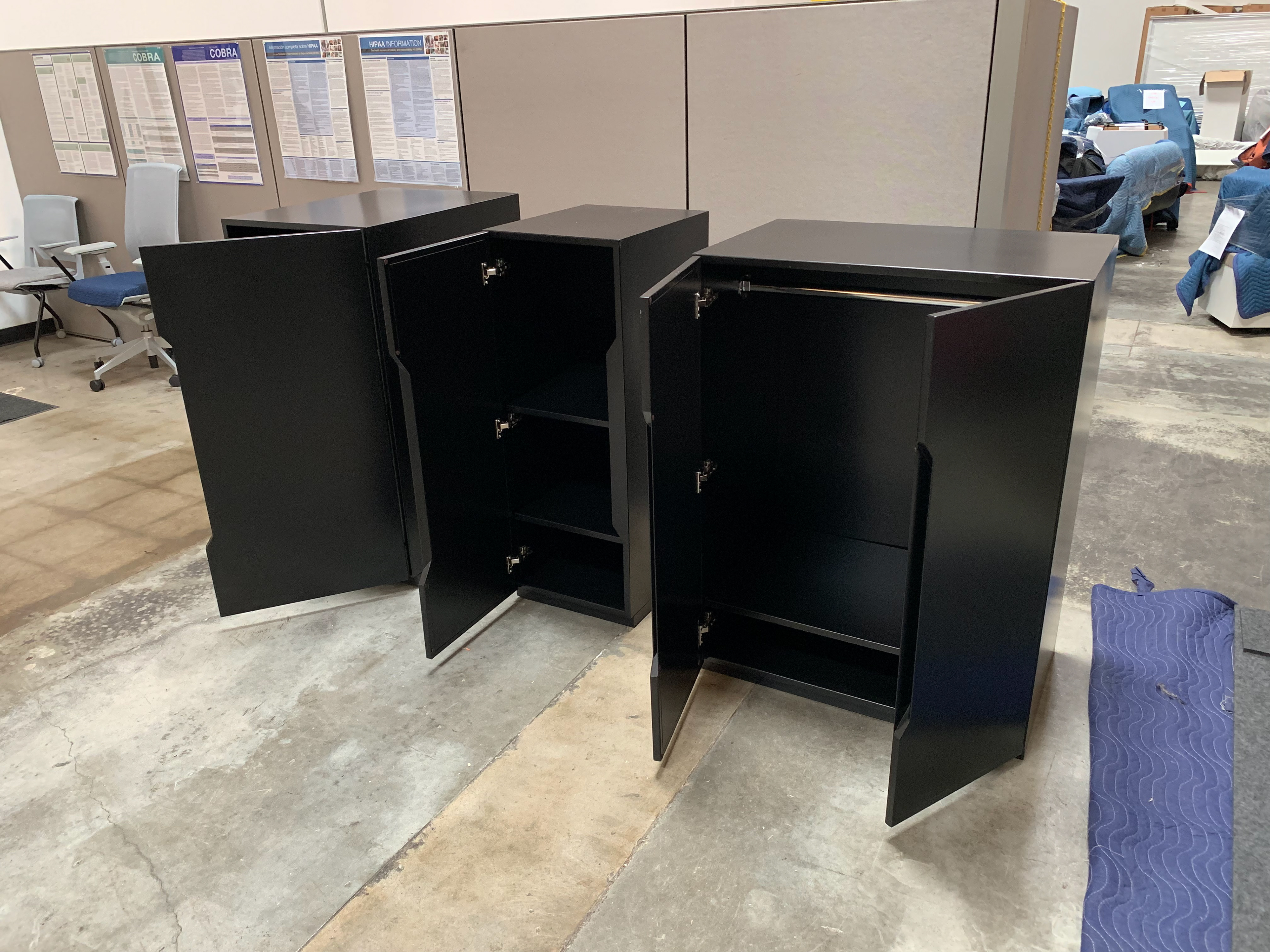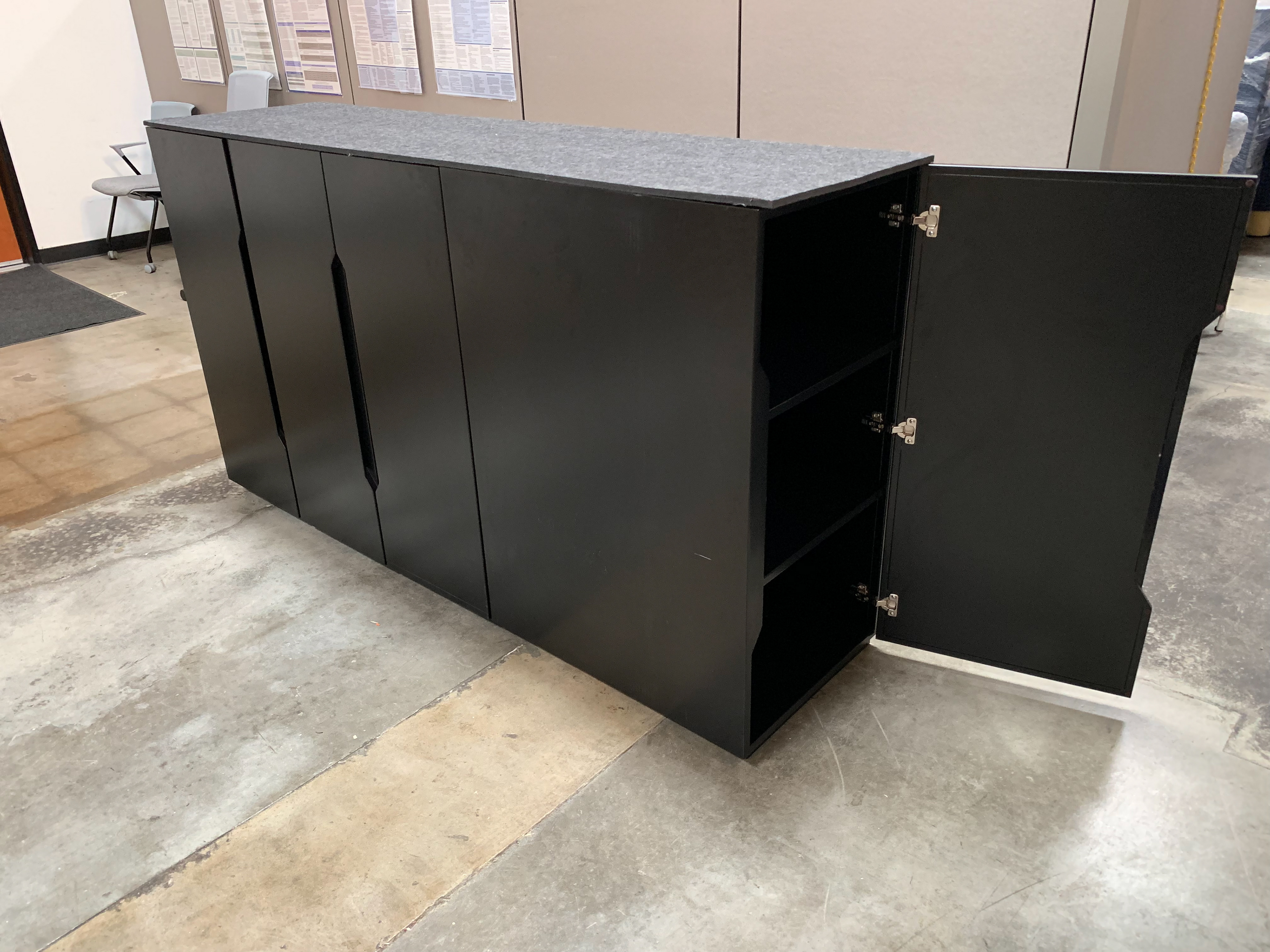 All the front dividers were made with black tempered glass and a steel inner layer to make them magnetic. The side dividers were made with birch plywood and PET felt with a steel inner layer for magnets and also are also capable of being pinned. All of the tall cabinets also have a 1/2” PET mat on the top. The tabletops were made with 1.5” white oak butcher’s block with added custom power access to the power plugs.