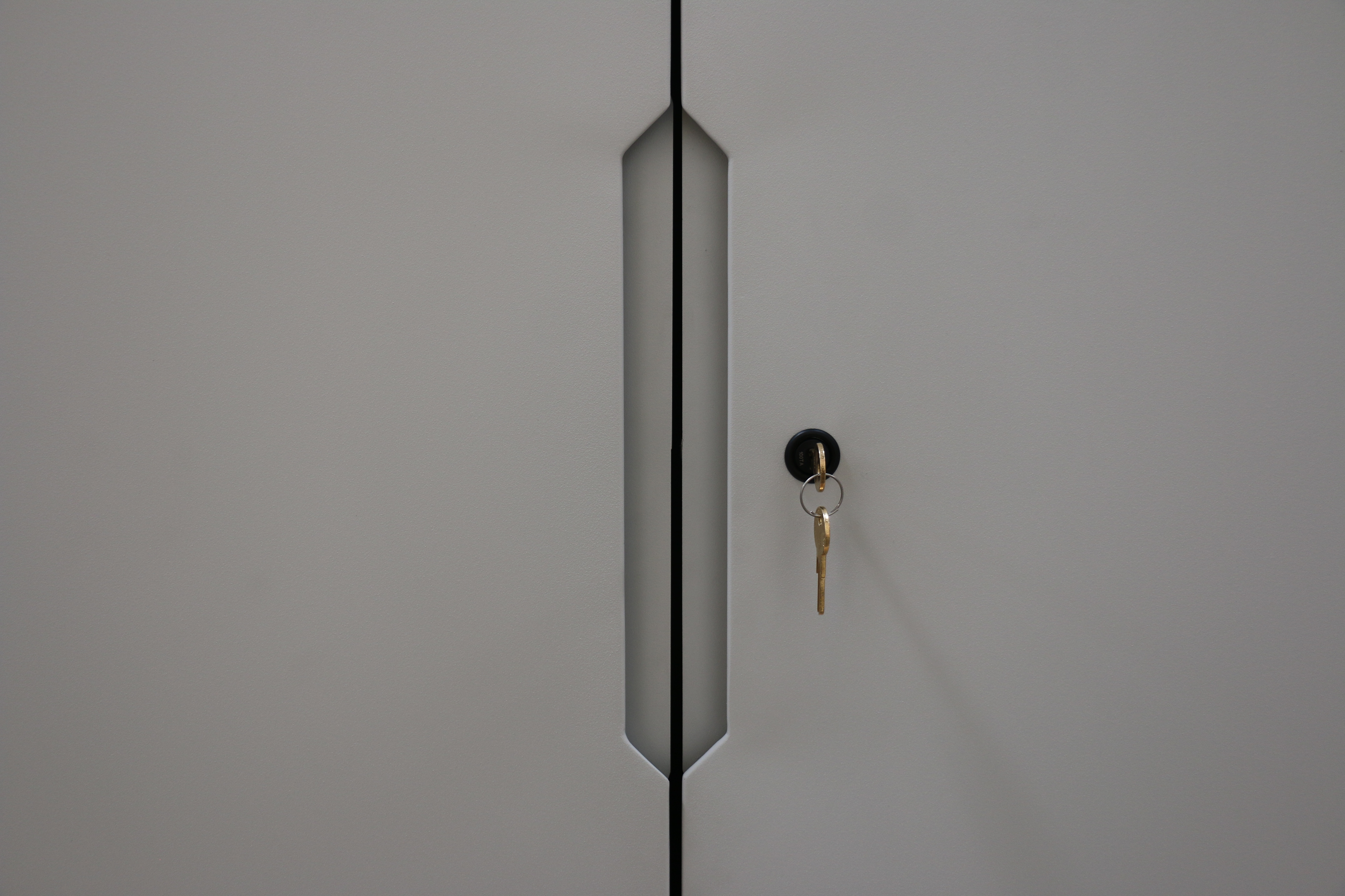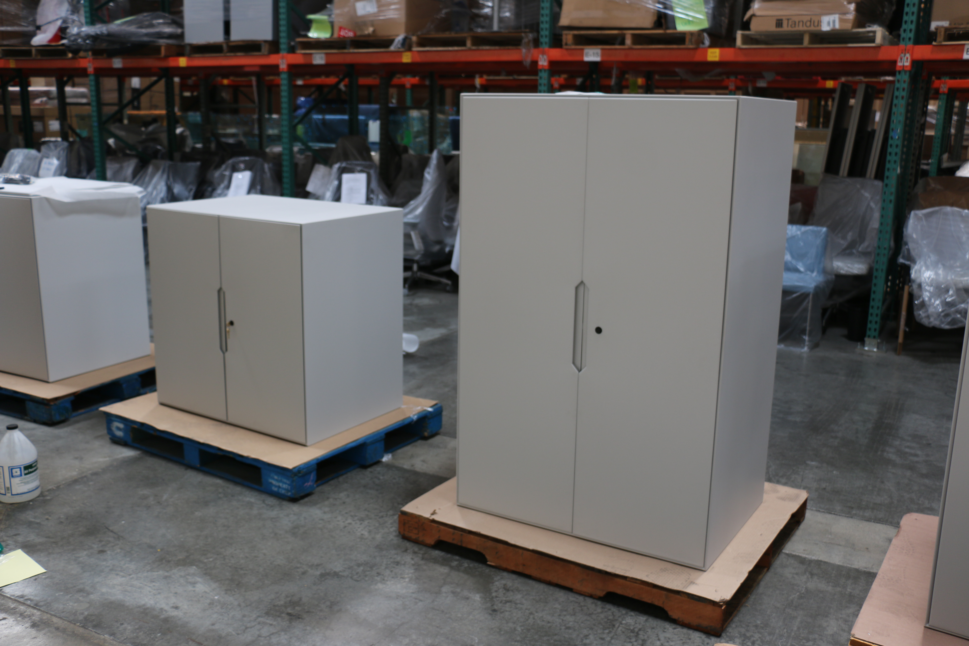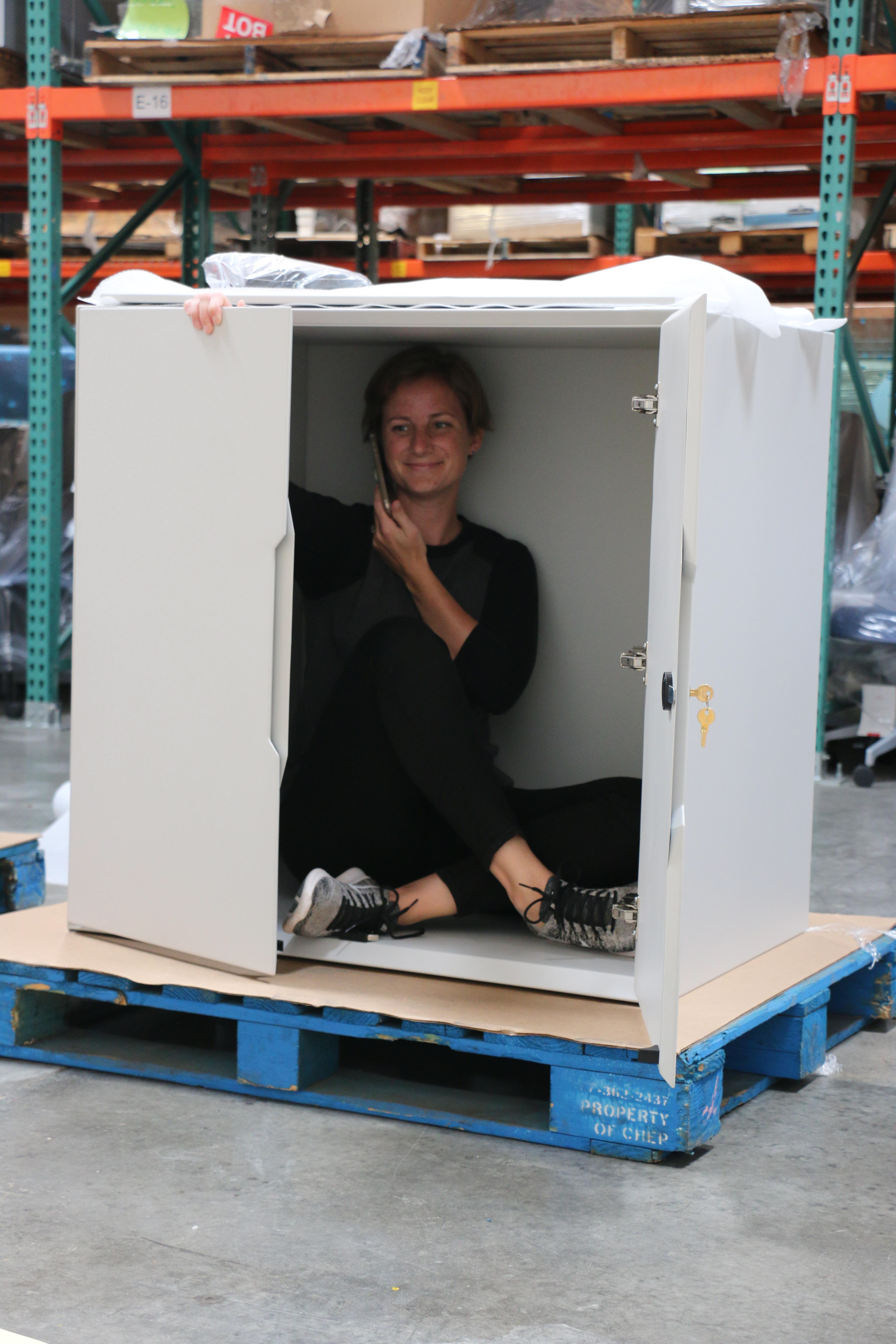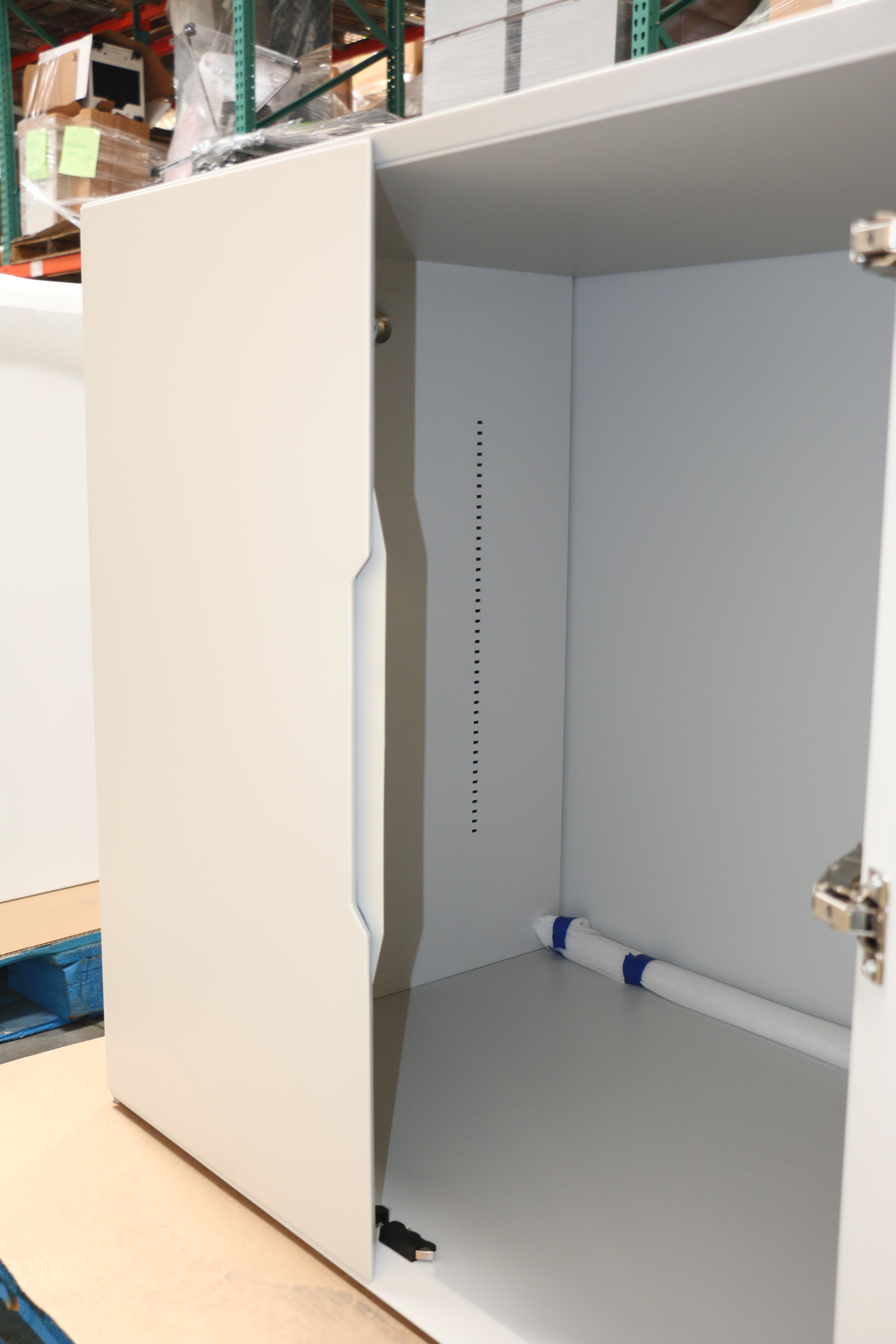 The cabinets are constructed of steel with a custom powder coat finish, have seamless body construction and the front doors are self-closing with mitered edges. The finger pull is also mitered.